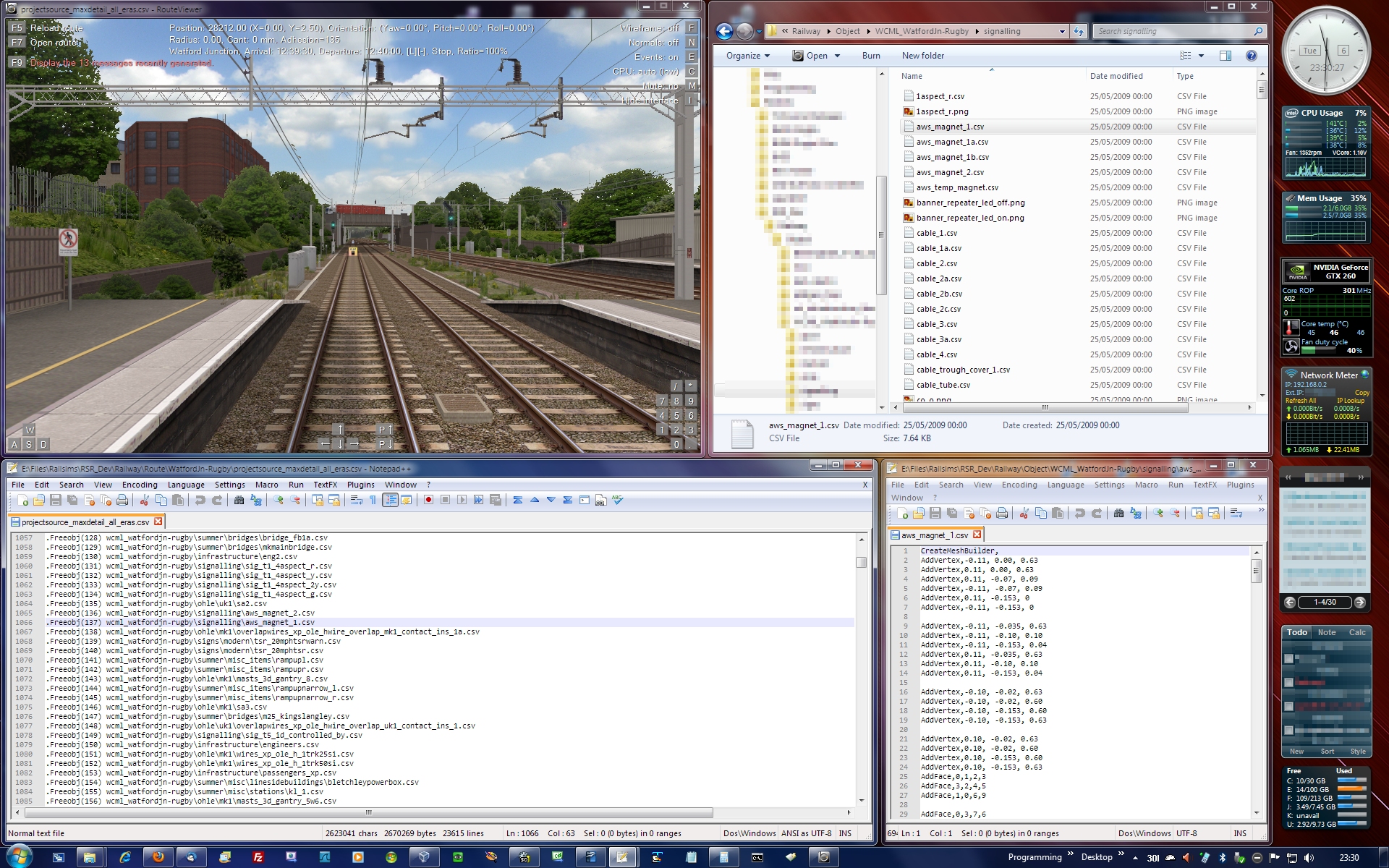 I installed a Zalman fan controller in a spare 5 1/2 inch drive bay in this system to manage thermal performance, and the controller included a VFD (Vacuum Flourescent Display) for monitoring purposes. This is now in use in the Core i7 4770K system and still going strong. I initially had repeated problems with RAM instability on this Core 2 Quad system, causing random BSoDs (Blue Screens of Death) in Windows. Reducing the DDR data rate helped, but ultimately the problem was solved by using RAM from a different manufacturer. After this, the system was stable and a pleasure to use. The following openBVE add-ons were developed on it: